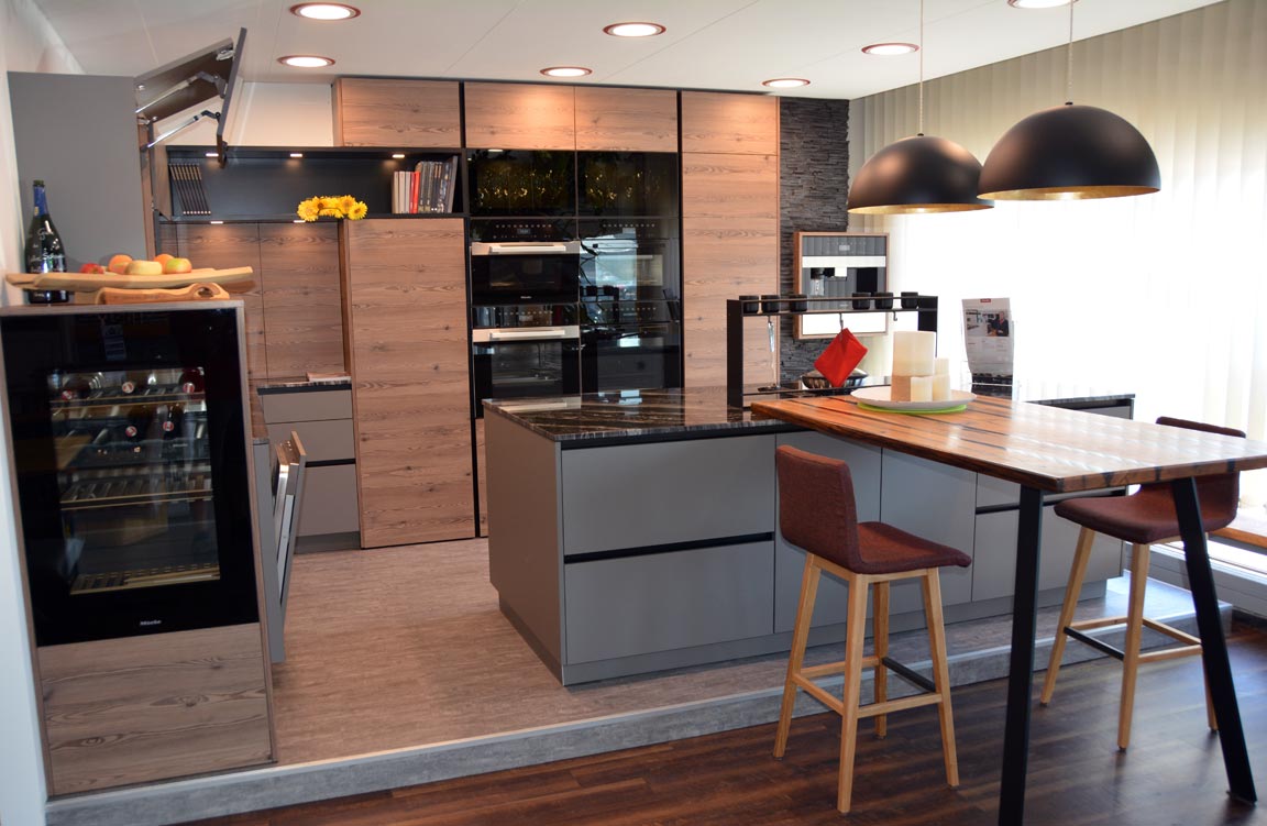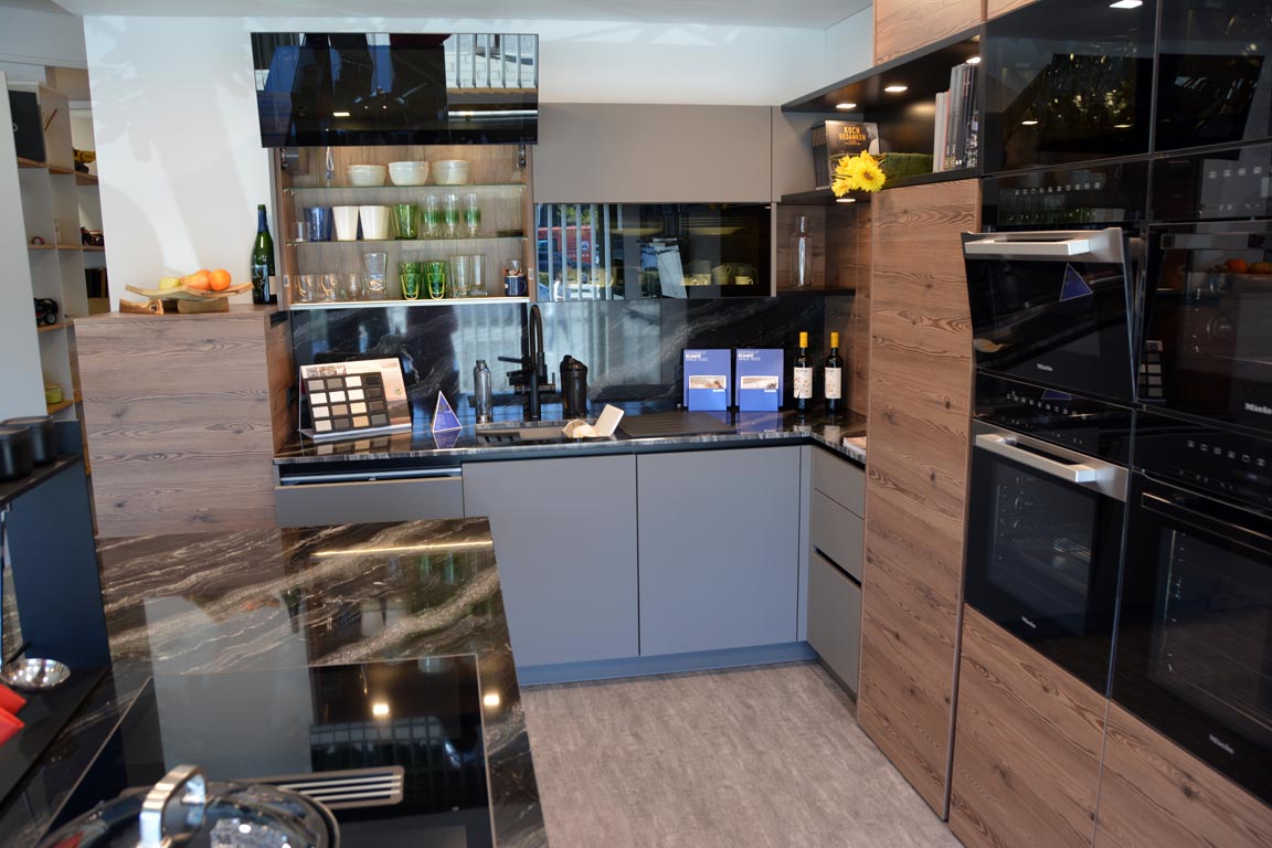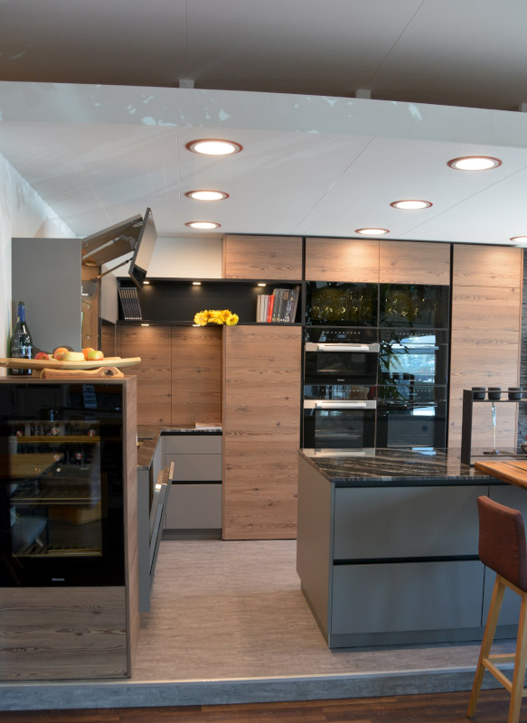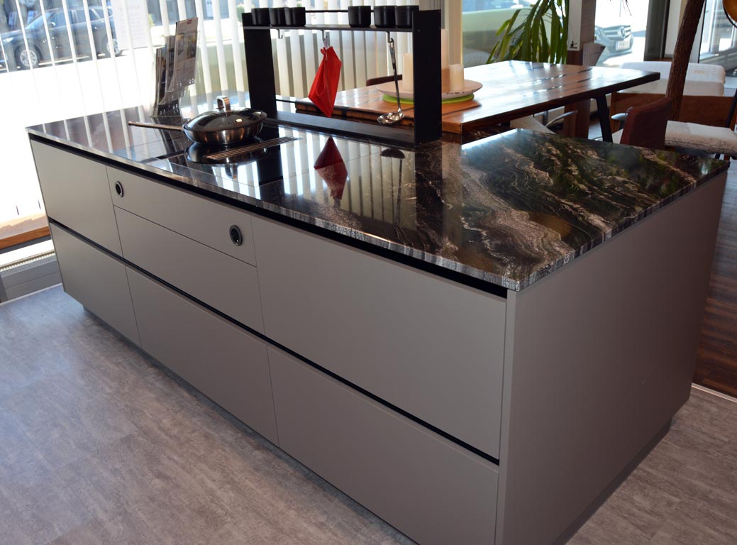 Grifflos-Griffmulde schwarz, Front in Acrylquarz Supermatt (Nanoo-Oberfläche) und Dekor Berglärche kombiniert, Korpus in Dekor Oriongrau, Eckteil 315x367 cm, Höhe links 207cm, rechts 243 cm, Arbeitsplattenhöhe 91 cm, Kochinsel 255x108x91 cm